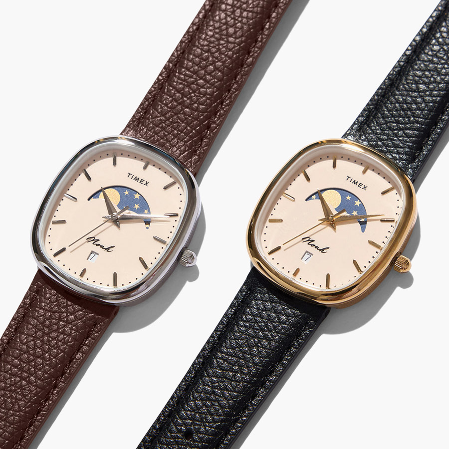 노아(Noah)와 타이맥스(Timex)의 네 번째 협업이 진행됐다. 두 브랜드의 이름 그리고 전작의 인기만으로도 이번 신제품 오벌 문페이즈(Oval Moon Phase) 선주문 명단에 이름을 올리고 싶은 기분. 탱크를 떠올리게 하는 사각 케이스 문페이즈 워치 금장 모델의 리셀가를 떠올리면 눈앞에 놓인 오벌 문페이즈를 쉽게 지나치지는 못할 거다.