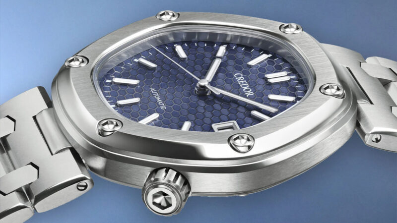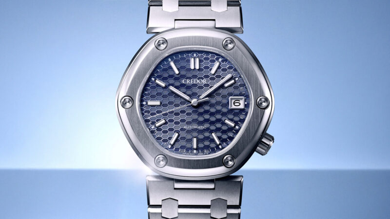 이번에 모습을 드러낸 크레도르 로코모티브 GCCR995는 던 블루(Dawn Blue) 색상의 다이얼 버전이다. 그 이름처럼 새벽 그리고 시작을 의미하는 컬러다. 그 위에 벌집과 유사한 육각형 패턴을 적용, 빛이 문자판 표면에 닿을 때 은은하게 반짝인다. 마치 물결 같다.