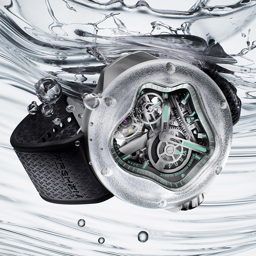 티타늄으로 이루어진 케이스는 마치 물이 튀는 연못을 떠올리게 한다. 물방울이 퍼지고 흘러가는 순간성처럼, 시간도 고정된 것이 아니라 끊임없이 변화하고 흩어진다는 그의 철학이 디자인 전반에 스며 있다.