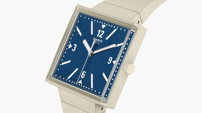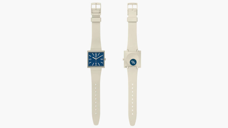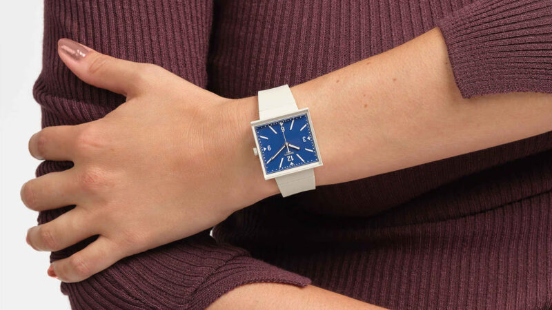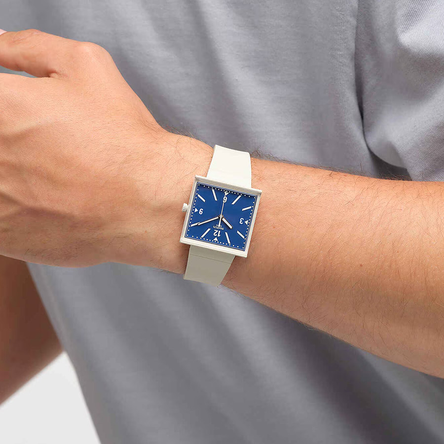 케이스는 사각형 바이오세라믹으로, 다이얼을 측면에서 볼 수 있도록 에지 투 에지 바이오소스 글래스를 적용했다. 다이얼은 블루 컬러. 야광 처리된 시침과 분침이 명확한 대비를 만든다. 고정 버클이 달린 크림색 바이오소스 실리콘 스트랩으로 마무리했다.