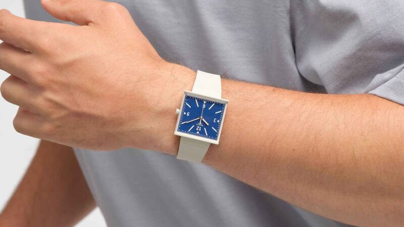 케이스는 사각형 바이오세라믹으로, 다이얼을 측면에서 볼 수 있도록 에지 투 에지 바이오소스 글래스를 적용했다. 다이얼은 블루 컬러. 야광 처리된 시침과 분침이 명확한 대비를 만든다. 고정 버클이 달린 크림색 바이오소스 실리콘 스트랩으로 마무리했다.