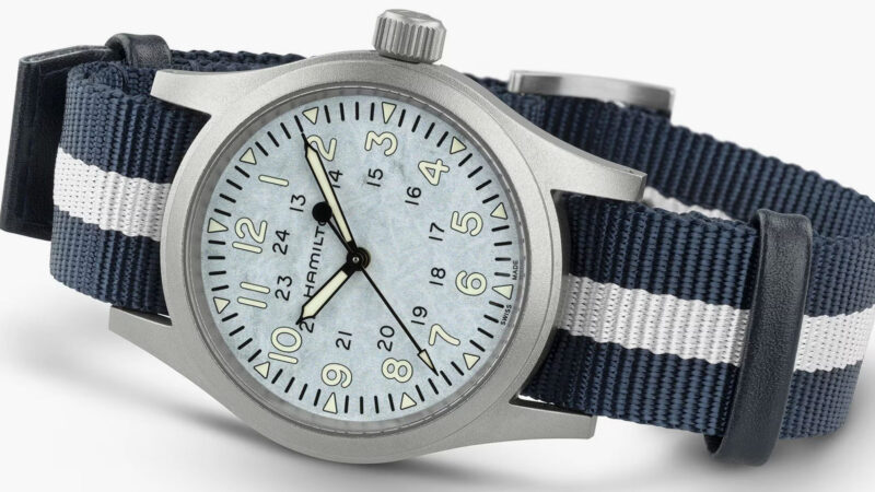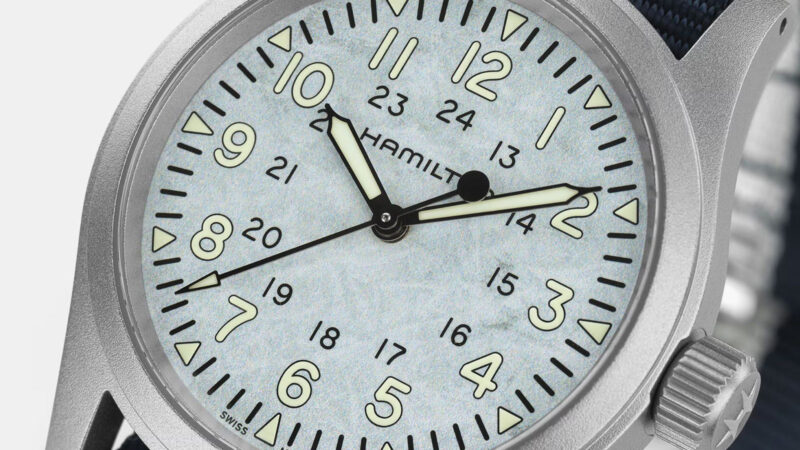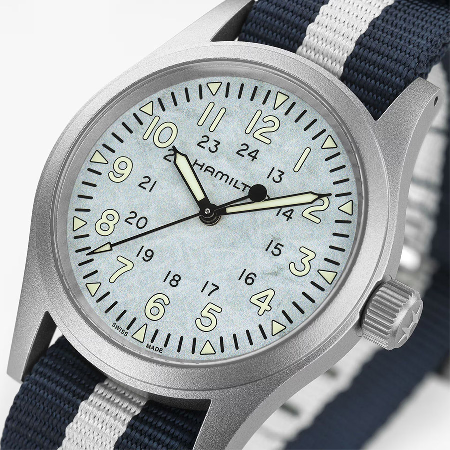 아이스블루 컬러 다이얼의 독특한 질감은 변화무쌍하게 빛을 반사하는 빙하의 모습을 닮아있다. 색상과 질감이 선사하는 시원시원한 느낌은, 카키필드 시리즈 특유의 큼직한 루미네이팅 숫자 인덱스와 절묘하게 맞아떨어지는 중. 다이얼의 윤곽이 굵지 않아 가독성이 살짝 떨어지는 점은 아쉽다. 스테인리스 스틸 케이스는 샌드 블라스트 처리로 차가운 분위기를 살렸으며, 케이스백에는 마테호른산의 실루엣을 새겨 자연에 대한 경의를 표했다.