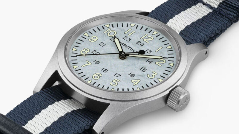 아이스블루 컬러 다이얼의 독특한 질감은 변화무쌍하게 빛을 반사하는 빙하의 모습을 닮아있다. 색상과 질감이 선사하는 시원시원한 느낌은, 카키필드 시리즈 특유의 큼직한 루미네이팅 숫자 인덱스와 절묘하게 맞아떨어지는 중. 다이얼의 윤곽이 굵지 않아 가독성이 살짝 떨어지는 점은 아쉽다. 스테인리스 스틸 케이스는 샌드 블라스트 처리로 차가운 분위기를 살렸으며, 케이스백에는 마테호른산의 실루엣을 새겨 자연에 대한 경의를 표했다.